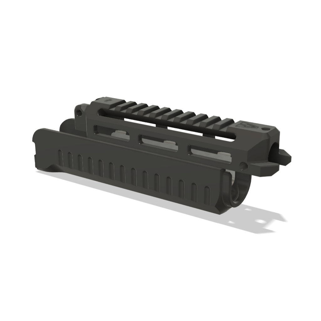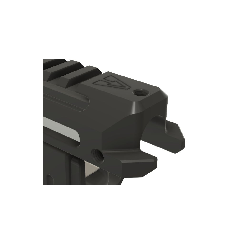 Horní část je vybavena nízkoprofilovou desetidrážkovou picatinny lištou, která je plně zapuštěná do kontury předpažbí. To zlepšuje ergonomii úchopu a nezasahuje do zorného pole mířidel. Lišta pro montáž příslušenství je umístěna nízko k ose hlavně, což umožňuje instalaci malého kolimátoru typu Aimpoint T1 a zároveň poskytuje dobrý výhled na mechanická mířidla skrze sklo kolimátoru. Díky aretačním šroubům se horní část předpažbí ani nehne a drží tak perfektně nástřel i po opakovaném sejmutí a nasazení. Pro zachování monolitické konstrukce jsme zesílili vidličky v přední části (viz 4. foto), které jsou tak mnohem odolnější vůči žáru při delší střelbě.
